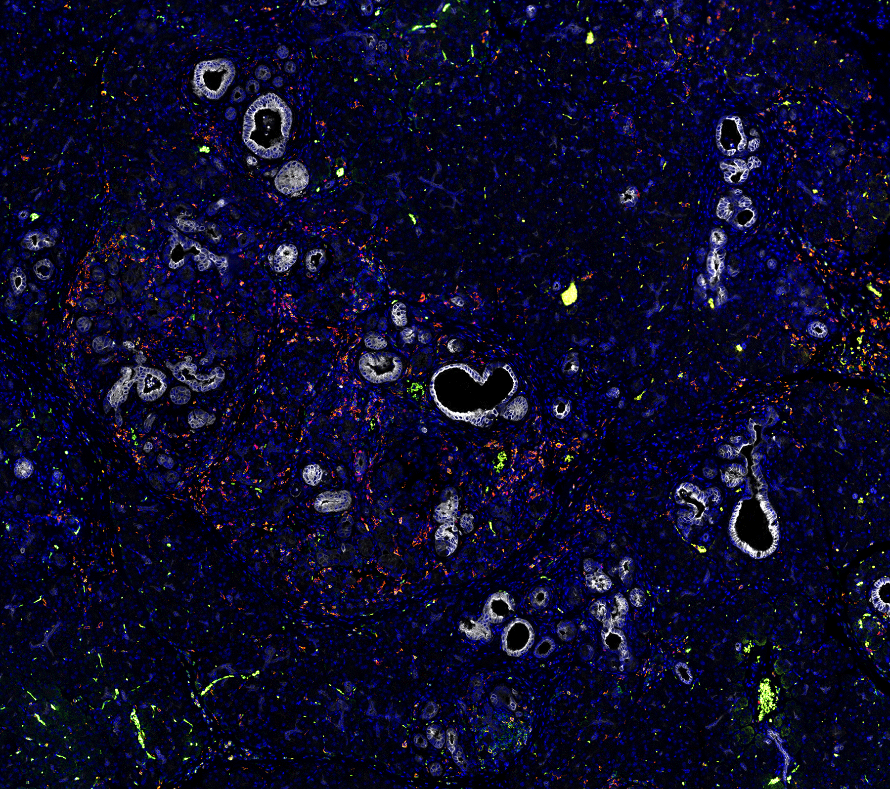 Mouse models of pancreatic cancer provide a unique opportunity to study which non-malignant cells are present in the earliest stages of pancreatic cancer. Pictured above are pre-invasive pancreatic cancer lesions stained to highlight cancer cells (white), T cells (orange/yellow), Macrophages (light blue), and Neutrophils (Red). Image was generated by Alex Jefferson and Emma Dawson.